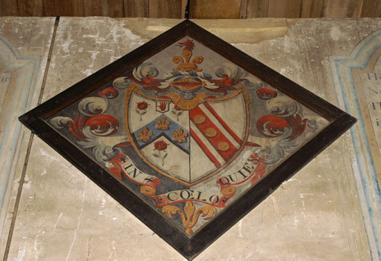 The hatchment of Sir William Cope. Hatchments are not, as commonly supposed, mere ornament. This supposition probably came about because of the prevalence of royal coats of arms displayed in our parish churches from the around the end of the c16. Genuine hatchments such as this one were hung outside the homes of deceased gentry for a period of a few months before being removed for display at the parish church.
