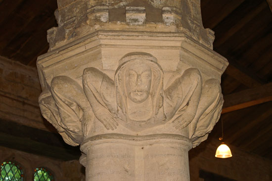 The “linked arm” capitals. The top two pictures are the north aisle; the lower two pictures are the south. The carvings on all the North Oxfordshire churches are a treasure house of information on the dress styles of the day. Note that the abaci surmounting the capitals have identical mouldings and the geometry of north and south arcades also appears roughly identical. Yet the north aisle has castellations. Strangely, they rather look as if they were added as an afterthought. If so, one can only wonder why this was only done on one arcade! Note that on all the linked arm capitals in the North Oxfordshire group churches are single sex - indeed they are never mixed on one side of the aisle, never mind on a single capital. This leads to speculation that the congregation (and let us remember that seating would have been available only for the infirm at this time) were similarly segregated.