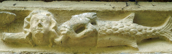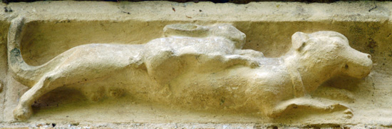 This is just a taster. To see the full frieze click HERE. Just in these 6 examples you can see the exuberance of the themes. There are many animal and hunting scenes. Top left we see a huntsman with cudgel over his shoulder and a dog on a leash behind him. Middle left there us a hound with a bird in his mouth. The bird seems to have webbed feet. Bottom Left we have a stage. Top right there us a dog with a rabbit. Middle Right is a rather singular merman who seems to be holding some other creature over his shoulder. Bottom right is a hare.