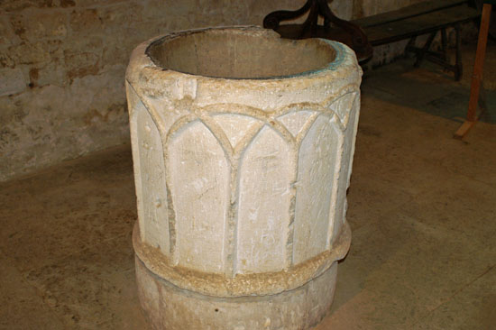 The font is simple to say the least. It could, in truth, be late Norman or Early English. Given that the original church was Norman, however, it seems unlikely to me that the font would have been replaced only 100 years later.
