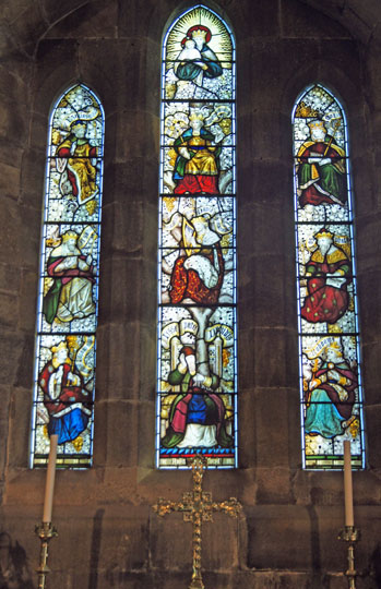 Right: The glass in the east window is a Jesse Window (showing Christ’s family tree from Jesse onwards) made by Charles Kempe. Unusually, it does not have Kempe’s trademark “wheatsheaf” symbol. Thus, it is believed to be a very early example of his work. The window itself is a typical triple lancet Early English configuration, albeit restored in the c19.
