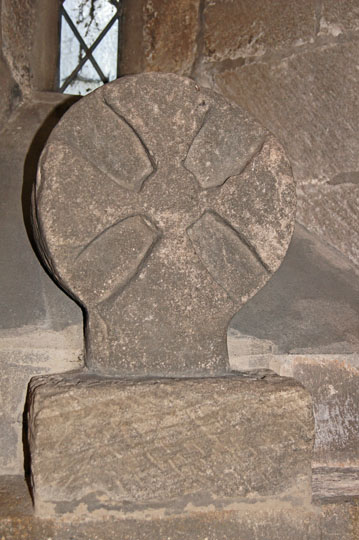 Beneath the Norman window in the sanctuary is the head of a stone cross that was found beneath the vestry floor. It is now believed to be an Anglo-Saxon “preaching cross” around which people would gather when churches were few. The Celtic form of Christianity as evinced by St Aidan was much less hung up on the availability of sacred buildings than the Roman version championed by St Wilfred. Escomb in County Durham has a very different example behind its altar of what also might have been a preaching cross.