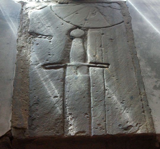 Left: The Preaching Cross displayed below the Norman window. Centre: The incorporation of tomb slabs into the fabric of churches in not particularly uncommon, but it is rather commonplace in this part of the country. This one set below a window in the choir is a fine one, however, clearly belonging to a knight of some substance. Right: The simple Anglo-Saxon font. Compare it with the much more substantial immersion font at Escomb.