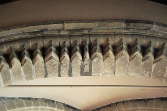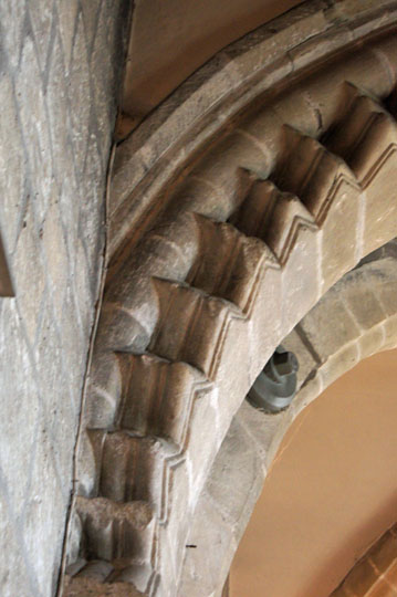 Left: The Norman sanctuary seen from the choir. Note the elegant triple clusters of half-pillars supporting the arch and the vault. Centre: Detail of the unusual forward-facing Norman zig-zag moulding.