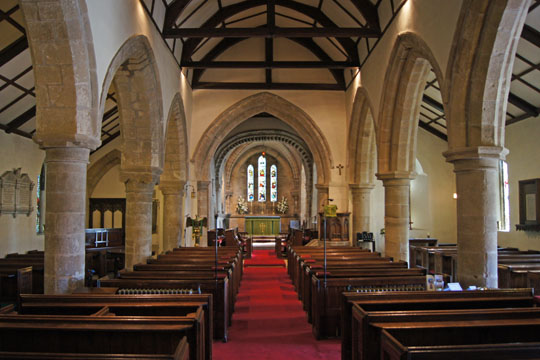 The view to the east. Note the carved capitals on the two westernmost pillars of the north arcade. Note also the conspicuous - and lopsided - Norman sanctuary arch.