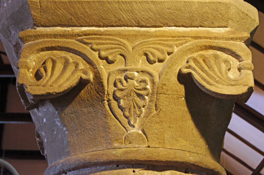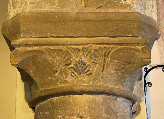 The two rather surprising capitals of the north aisle. That on the left certainly does not look Norman and the church firmly believes it to be Roman.. That on the right is more Norman-looking with its water leaf design at the corners. The foliage is reminiscent of the Roman capital so perhaps the builders consciously mimicked it.
