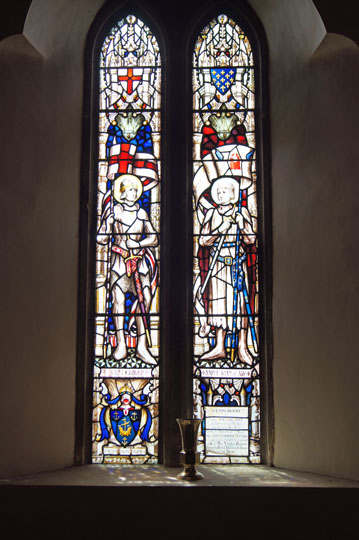 Right: Those who have read a lot of these pages will know I am no great fan of stained glass but Heddon’s windows are very nice indeed and were given by Sir James Knott in memory of his two sons killed in World War I. In this pair of windows we have on the right an exceedingly rare occurrence of Joan of Arc in an English church, complete with armour and the fleurs-de-lys crest of France. To her left is St George, and the Maid of Orleans must be highly flattered to be represented as having been as tall as he was!