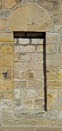 Left: Anglo-Saxon long-and-short-work at the quoin of nave and choir. Note the Anglo-Saxon doorway to the right. Note also just above the window the faintest outline of the original roofline. Centre: The blocked Anglo-Saxon doorway through to the choir.
