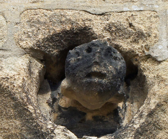 Left: One of the Early English chancel windows with a head inset above it. Centre: Close ups of the two badly weathered heads Right: The east end.