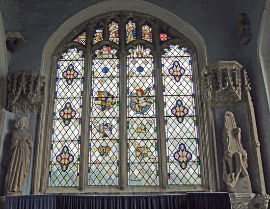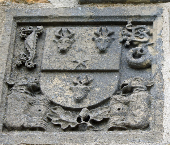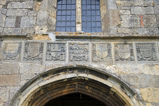 Left: The interior of Nan Scott’s Chamber above the porch. It is for you to decide whether you believe the legend. Certainly it is not so implausible but even if you are a sceptic the room does make you think about the horrors that the Plague brought to the world. I found it a very spiritual place to be. Right: Above the porch are these seven coats of arms intended to show off the “good connections” the Barton family managed to make through their wealth. The stag emblem of Nottinghamshire is much in evidence.