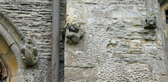 Above: Three carvings on the east end of the church. Right: The church from the north side. The Barton-funded improvements are clear to see. It is perhaps a little unfortunate that they contrast so starkly with the very plain and exceedingly well-buttressed nave!
