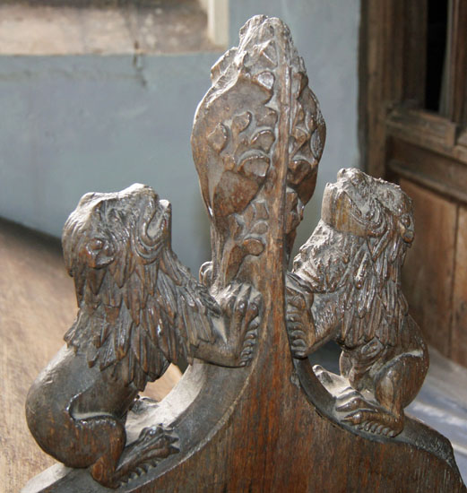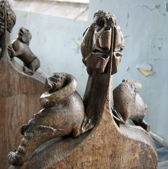 Right: Two examples of carvings that, rather oddly, adorn the screen at floor level. These were originally part of the mediaeval choir stalls. They add to the overall impression that the church was decorated with rather more enthusiasm and exuberance than skill!