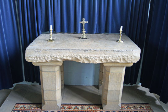 Left: The monument to John Barton and his wife, Isabella. Note the skeletal (and anatomically incredible) figure below. There was a fatalistic fashion at the time for acknowledging the mortality of the flesh as a warning to others - “As I am so shall ye be”. Right: The original mediaeval stone altar now reinstated into the south chapel.