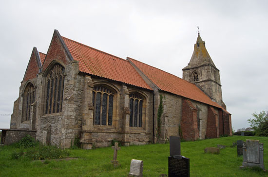 Above: Three carvings on the east end of the church. Right: The church from the north side. The Barton-funded improvements are clear to see. It is perhaps a little unfortunate that they contrast so starkly with the very plain and exceedingly well-buttressed nave!