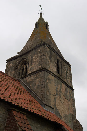 Left: The early Decorated tower. Like the rest of the church it has a rather “rustic” look and its stucco is in a parlous state. Curiously, however, it has a grotesque cat-like sculpture at each of the corners above the parapet (below). Nothing about Holme is “normal”!