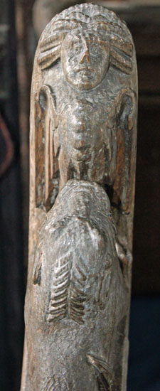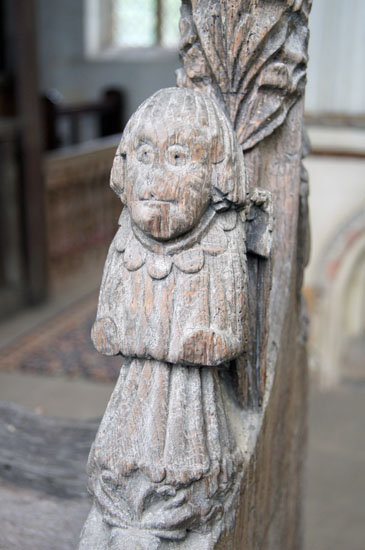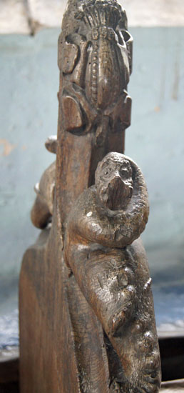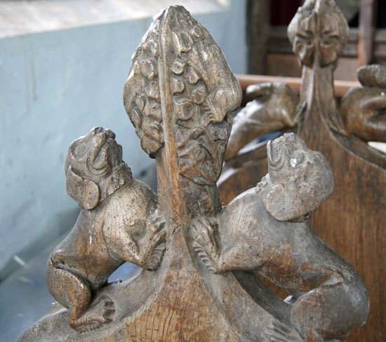 Right: Two examples of carvings that, rather oddly, adorn the screen at floor level. These were originally part of the mediaeval choir stalls. They add to the overall impression that the church was decorated with rather more enthusiasm and exuberance than skill!