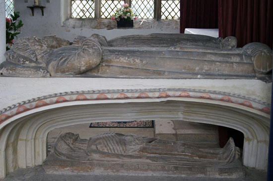 Left: The monument to John Barton and his wife, Isabella. Note the skeletal (and anatomically incredible) figure below. There was a fatalistic fashion at the time for acknowledging the mortality of the flesh as a warning to others - “As I am so shall ye be”. Right: The original mediaeval stone altar now reinstated into the south chapel.