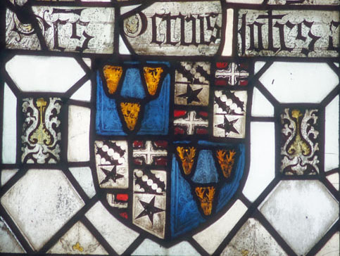 Detail from the chancel window. As with so many mediaeval glass windows, restoration has meant that the recovered fragments have been re-assembled as a kind of patchwork. This, however, is a very fine “collection” and serves, in my view, to show how mediaeval glass had an artistic finesse and good taste that compares very favourably to the trashy, gaudy factory-produced Victorian glass that disfigures many English parish churches. On the left is the central figure of a bishop. Top right is a delightful cluster of three heads to be seen at the bottom of the window itself. What were they, I wonder? The panels centre top and bottom are coats of arms which show similarities to those carved above the church porch by one of John Barton’s descendants (see below). The quatrefoil design (bottom right) is one of the c14 panels donated to the church when Annesley Church was abandoned.