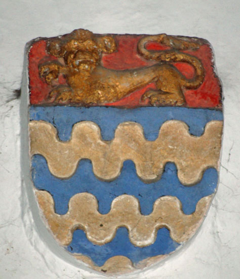 In all but two of them we can see the initial “B” on the right hand side, denoting “Barton”. Two are “JB” denoting John Barton. Note the Barton trademark in the picture above, matching the painted corbel on the inside of the church. At the bottom of this shield there are two wool sacks. Again, the Calais Wool Staple is shown above left complete with a falcon and two curiously-arranged dolphins.