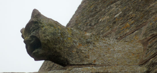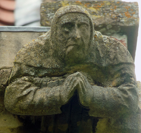 The exterior of Holme Church also has some quirky carvings, scattered rather haphazardly! Left: On one corner of the porch are two monsters fighting with each other. Right: At the west end of the south side is this large and rather unusual carving of a cowled monk in prayer.