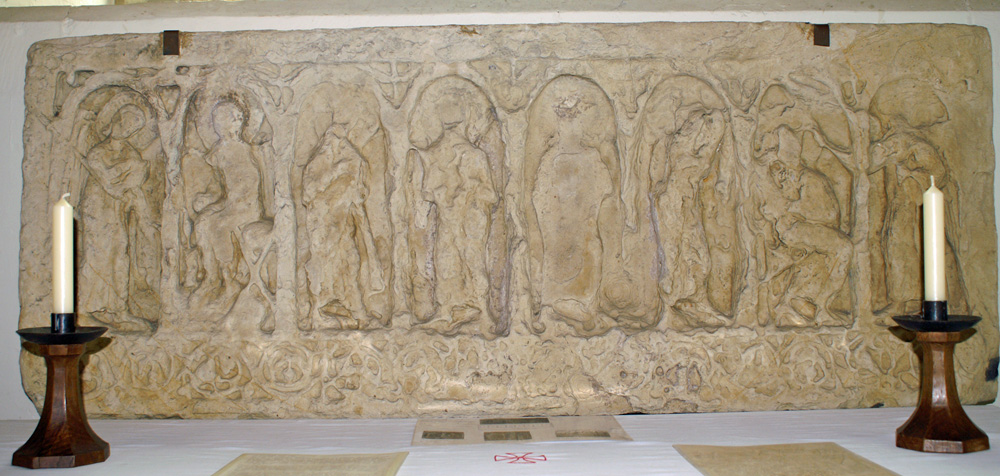 Eight figures are set within round topped panels. The outer figures are angels (the left hand figure is the best-preserved) and they look inwards. The second figure from the left is clearly seated. The Church Guide says these two left hand figures constitute the Annunciation by the Archangel Gabriel to Mary the Virgin of the forthcoming birth of Jesus. The figures in the other panels cannot be identified due to weathering. Above each intersection of the panels is a dove. The lower decoration is of entwined birds and vine leaves.