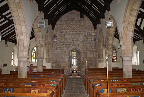 The interior view towards the west end shows the extraordinary contrast between the new whitewashed Gothic style arcades and the original west face of the Saxon tower, with its herringbone masonry courses, patchwork of dressed stones and sturdy tower arch.