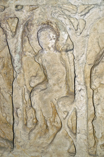 Eight figures are set within round topped panels. The outer figures are angels (the left hand figure is the best-preserved) and they look inwards. The second figure from the left is clearly seated. The Church Guide says these two left hand figures constitute the Annunciation by the Archangel Gabriel to Mary the Virgin of the forthcoming birth of Jesus. The figures in the other panels cannot be identified due to weathering. Above each intersection of the panels is a dove. The lower decoration is of entwined birds and vine leaves.