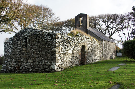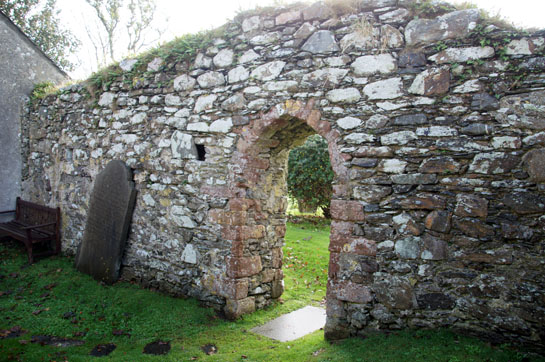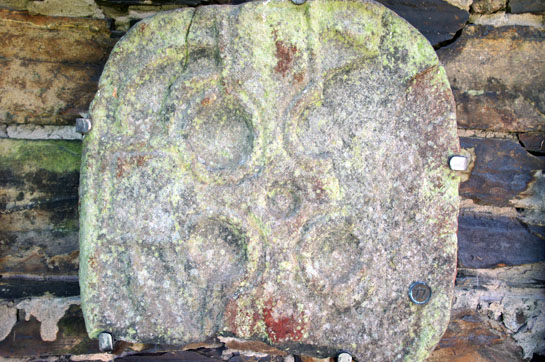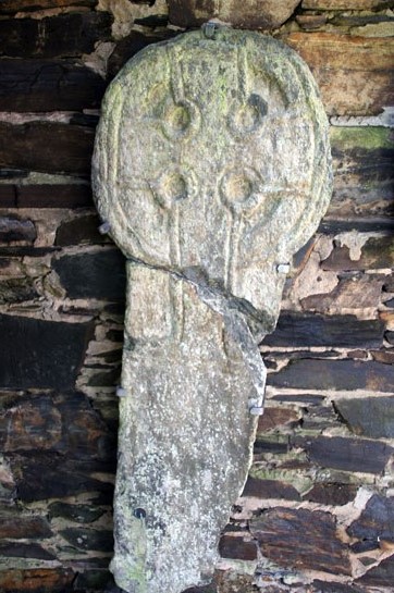 Left: The reverse side of the cross is quite plain. Everything about the Lonan Cross informs you that it was a practical device, not some decorative frippery. The fifth century monk needed a focal point for his devotions and could not afford the luxury of carving on every surface. Nor did he need the lofty, finely proportioned crosses that emerged a couple of hundred years later on the mainland. His faith would have been simple and uncluttered by the doctrinal complexities so beloved of the early Christian Fathers. His cross was as robust and uncomplicated as his faith. I have already mentioned that this cross was planted only thirty years after the Romans left England. Here’s another chronological perspective: it predates the arrival of St Augustine to “convert” Kent by 150 years. Centre: The west end of the new church as seen from the keeil. Right: The round-ish south doorway of the keeil.