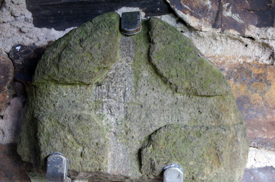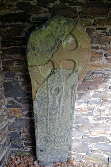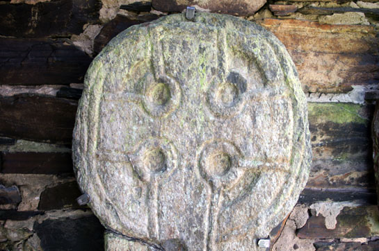 Left: The shelter for the rest of Lonan’s collection of crosses and slabs. Right: A wheel cross head similar to the churchyard cross but conspicuously cruder and less decorated.
