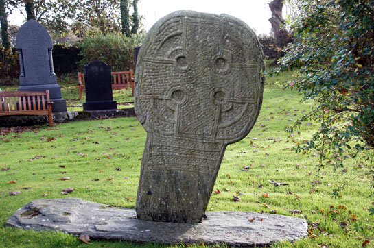 Indeed, Kirk Lonan is about as ancient a Christian site as you will find in the British Isles. The Irish missionaries arrived in the island as early as AD447. The Celtic cross still standing in the churchyard today dates from that century. To put this into perspective, the Romans left the mainland in AD410. Much of the first millennium carving in the British Isles is erroneously called “Celtic” when it is Saxon or Scandinavian but this cross is archetypal Celtic. The cross is over eight feet high and has a “wheel” head. As with most of the “crosses” on the island, its top is in fact circular and the cross is carved within it: it is a so-called “wheel cross”. The cross is made more elaborate by the carving of four small circles that have the effect of pinching the arms at their bases. The cross is superimposed on a carved ring that runs around the circumference of the head.