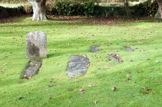 Left: The deeply-splayed north window has obviously been restored but it nevertheless bears all the signs of being quite ancient. Right: The churchyard has these ancient flat gravestones.