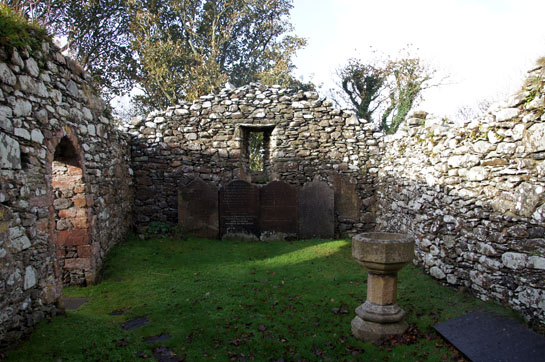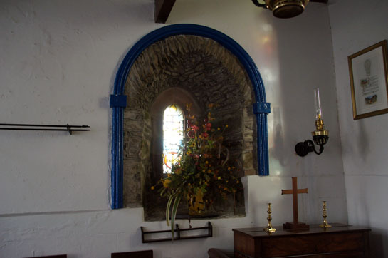 Today’s church is in two parts. To the west are the derelict and roofless remains of a twelfth century keeil. The site was gifted to the monks of St Bees on the Cumbrian coast and it was they who constructed it over the remains of a seventh century keeil. It is mainly of local field stone but the sandstone lintels are believed to have been brought from Cumbria. There were north and south doors although the northern one has been filled in. To the east is the “modern” church which is even smaller than the western keeil. It is hard to know how old this structure is. The deep splay of the north window suggests no later than the thirteenth century but it is dangerous to attribute English church-building practices to this island that would have been remote from the stirrings of Gothic architecture on the mainland. We only know that we are lucky to have it at all. In 1733 the parishioners petitioned for the building of a less remote church. It was not built until 1833 but a condition was that Kirk Lonan was levelled. Churches truly move in mysterious ways their wonders to perform, don’t they? Anyway, the church was not destroyed but was allowed to crumble before the Rev John Quine of the new church decided to restore it.