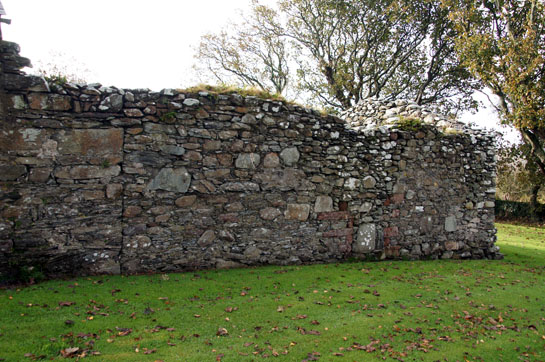 The twelfth century keeil. The remains of the north door (top left) can just be discerned. The doors and windows are not round-headed as we might have expected in England at this time. The monks of St Bees, however, came from a place where quarries would have been plentiful and would not have had experience of using field stone. So we might speculate that they had to improvise. The west window (top right) is rectangular. From the pattern of the masonry it seems possible that it replaced a larger window. There are (recent) gravestones sited within its precincts. The inside of the south door (lower left) shows that its outline was built of sandstone blocks. We can see (lower right) that the keeil was larger than the building which is now used.