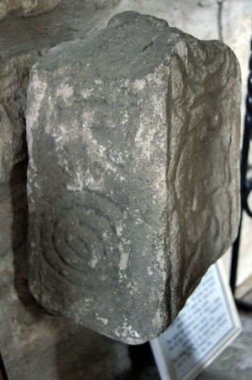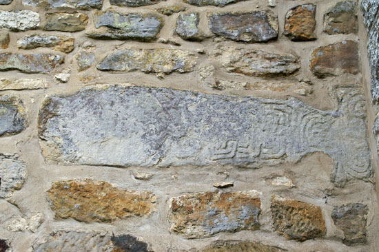 Left: A close-up of the sundial itself. The writing means: “This is the day’s sun-marking at every hour. And Hawaro made me and Brand, priest”. Right: One of several remnants incorporated into the walls; in this case a beautiful interwoven design, possibly from a cross shaft.