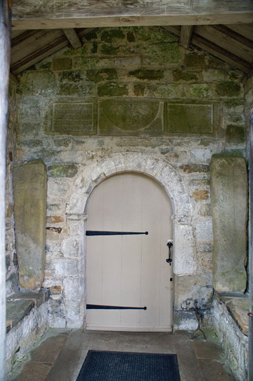 Left and Centre: The two grave slabs located within the north aisle. The right hand one (the further east) is believed to be the older of the two and both are believed to be c9 at the latest. Right: The south door with the sundial and inscriptions above. The doorway is c12. There is a grave slab either side.