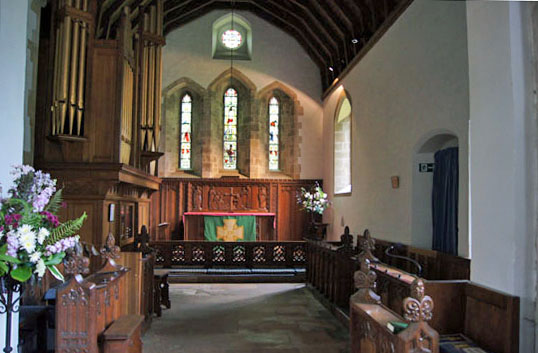 Left: Looking towards the west end. The tower doorway is Anglo-Saxon. The north aisle to then right is from about 1200 and would have been a quite early example of Early English style. Right: The chancel with, again, Early English style east windows. As this chancel is reckoned to date from 1661, however, we have to presume that these windows were retained from an ealier version.