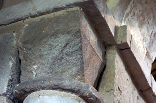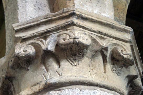 Left: One of the chancel arch capitals. Right: The three bay north arcade has quite plain capitals, except this one. The decoration is really quite elaborate with delicate carved designs below the main curled leaf motifs. What, I wonder, is the significance of the “V” shaped marks?