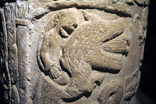 Left: The unfortunate St Lawrence is roasted on his griddle as another tormentor adds to his pain with a spear of some sort. Right: Close up of St Lawrence. In general, sculptors and artists right through the Norman and mediaeval periods were unwilling to depict any kind of pain on the faces of the martyrs. Perhaps it signified the knowledge that the victims would shortly be in Heaven.