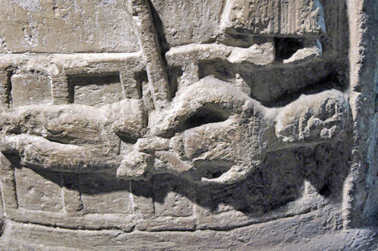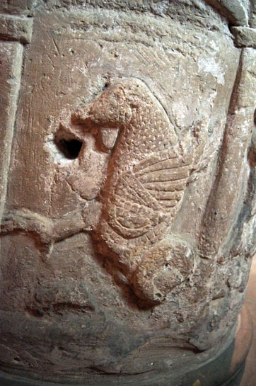 I suppose you would hardly know that these three pictures are of the same font but in fact they just show the difficulties with photographing a font in difficult light. The ambient light was poor and the little floodlight meant that each side received differing degrees of light and I can vouch for the fact that normal camera flash washed out all the detail of church carvings. So what you have here is my desperate efforts to make the designs on each side visible, at the expense of accurate colour reproduction. Left: The rare image of St Andrew being crucified on a saltire (that is, diagonal) cross. Centre: The Tree of Life Right: The rather unspectacular dragon