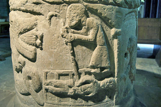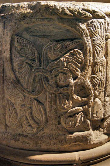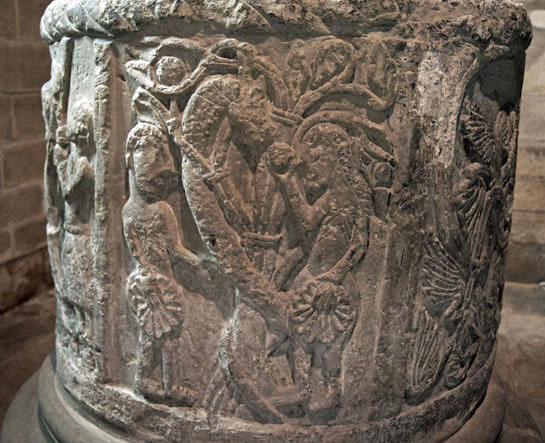 Left: The unfortunate St Lawrence is roasted on his griddle as another tormentor adds to his pain with a spear of some sort. Right: Close up of St Lawrence. In general, sculptors and artists right through the Norman and mediaeval periods were unwilling to depict any kind of pain on the faces of the martyrs. Perhaps it signified the knowledge that the victims would shortly be in Heaven.