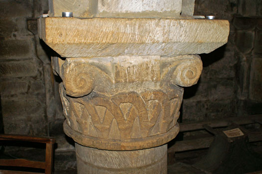Another ionic capital, this time supported by a crude pattern of interlaced arches similar to the “blind arcading” found in many Norman churches.