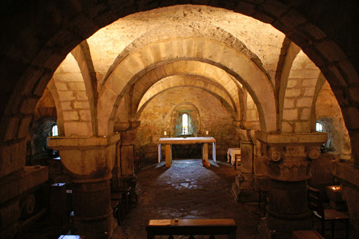From this view the squatness of the columns is very obvious. Note also the small windows to left and right at the end of the crypt’s “aisles”.