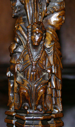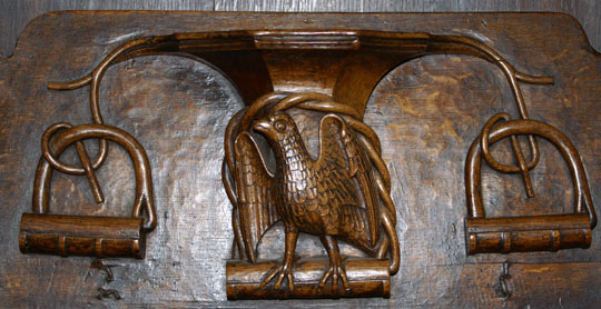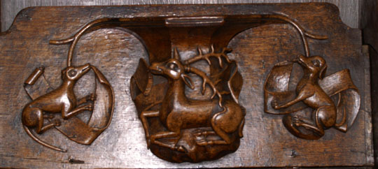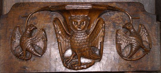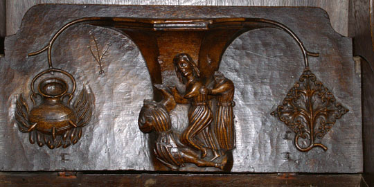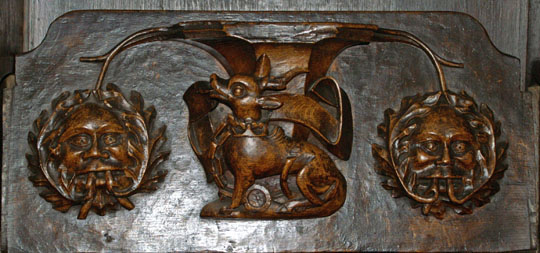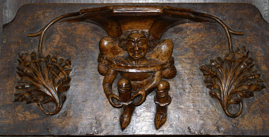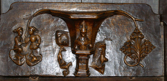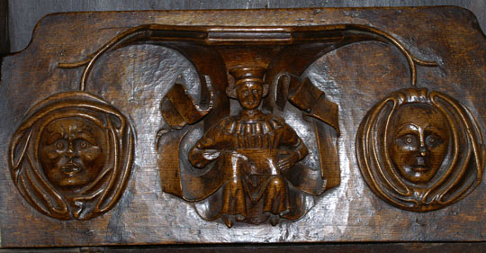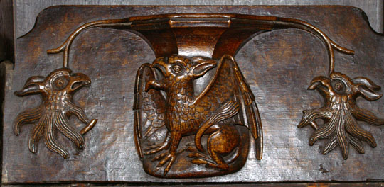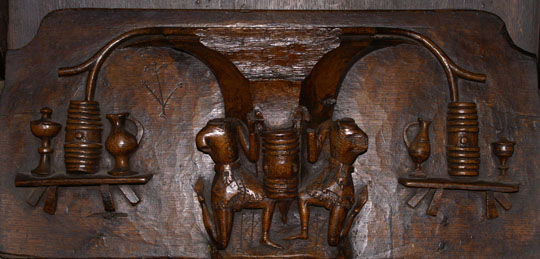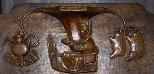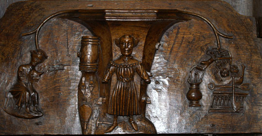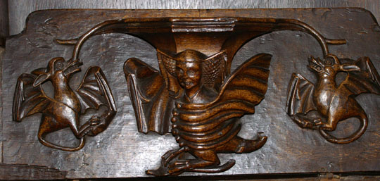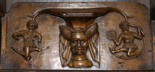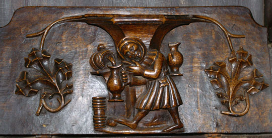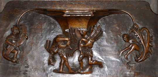 Perhaps the most famous of Ludlow’s misericords. On the left of the main design a dishonest ale-wife is draped, still clutching a flagon, over the shoulder of a demon who is dragging her off to hell. Another demon plays bagpipes. On the left, a third demon lists her sins. Twigged.