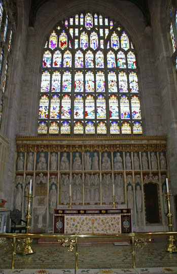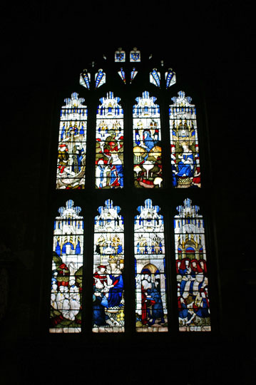 The high altar and east window. The chancel was rebuilt between 1443 and 1447. The window tells the story of the martyrdom of St Laurence.