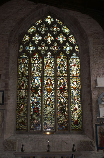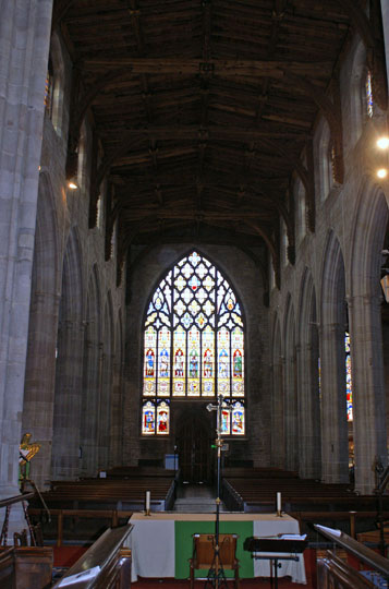 Looking towards the west end and window. The stone tracery is from the perpendicular period but the glass, depicting the various lords of Ludlow was inserted as recently as 1860.