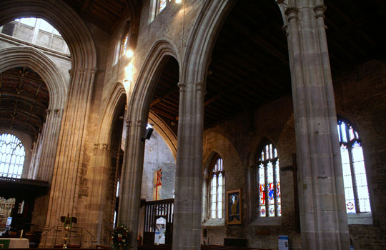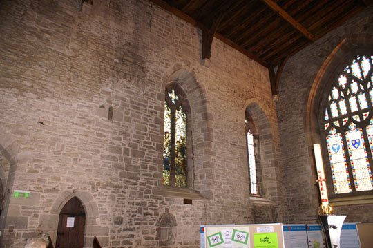 The south arcade with the aisle beyond. The walls date from the 1199 church although they have been since raised in height.