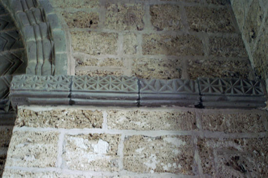 The decoration on the impost of the chancel arch is continued as a string course as far as the south wall. The pattern is different but this extension into a string course is also seen at Kilpeck.