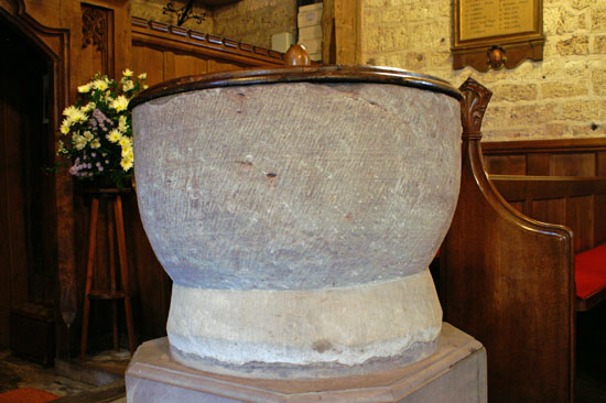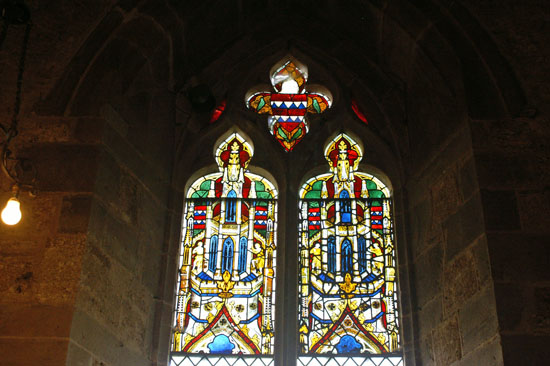 The arch to the apse is almost identical. The chancel is dominated - indeed overcrowded - by a knight’s effigy that has been placed squarely in its centre. This is believed to be of Hugh de Fresne who died in 1375. He was a crusader and so is shown with crossed legs. The c13 and c14 windows in the chancel show the de Fresne arms in their stained glass.