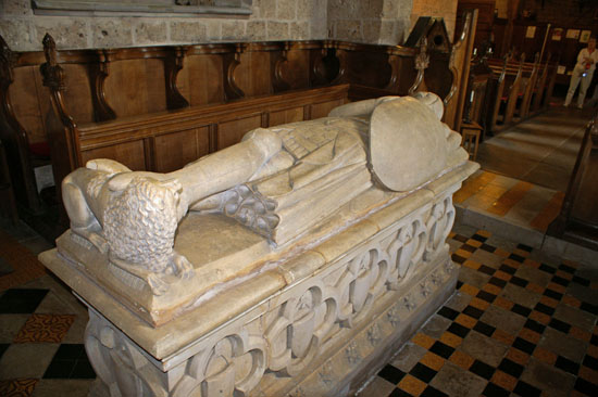 Sir Hugh de Fresne. A descendant of one of William the Conqueror’s knights, de Fresne built the manor house that is now Moccas Court that adjoins this church. The dog at his feet shows that he died at home.