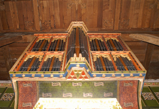 The apse is the original, windows and all, although George Gilbert Scott Jr did quite a lot of restoration. The organ dominates the west end, and it is a remarkable thing. Gillbert Scott designed it and Thomas Kempe (not be to be confused with Charles Eamer Kempe, the celebrated Victorian stained glass window artist) painted it.